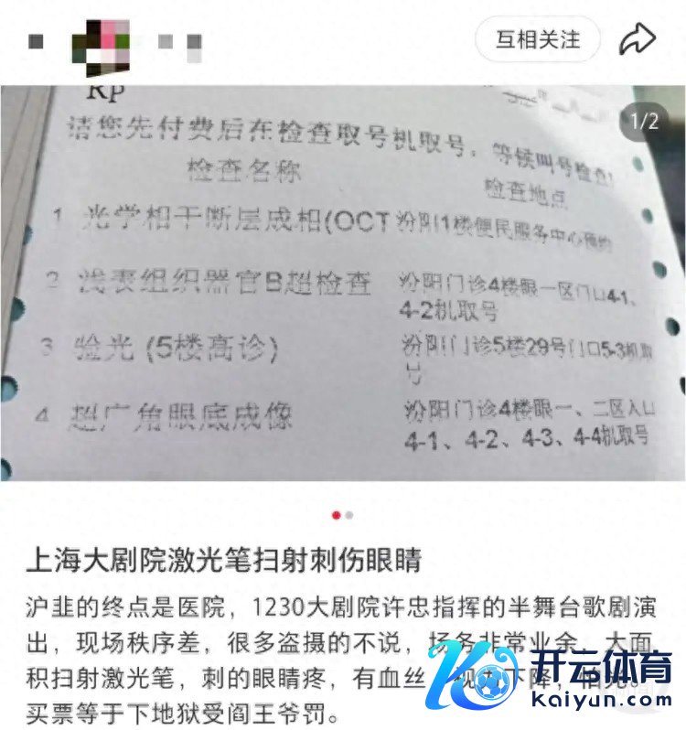 “1月2日我到眼科门诊作念了搜检,眼底莫得结构伤害,但验光眼光彰着下跌,现在照旧眼睛感到刺痛、有血丝、畏光,固然比起前几天照旧缓解不少。”高女士默示,我方依然拨打12345进行了投诉,接电话使命主说念主员默示会与上海大剧院的操纵部门疏导。