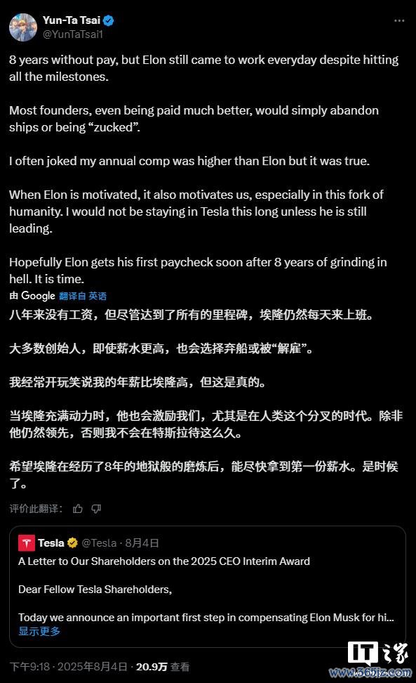 这位名为 Yun - Ta Tsai 的工程师在特斯拉职责已满五年,担任现职也已两年零三个月。他在帖子中提到,马斯克在往日八年间一直未领取薪酬,但即便如斯,他已经每天坚抓到公司职责,何况指示团队完成了诸多热切主义。